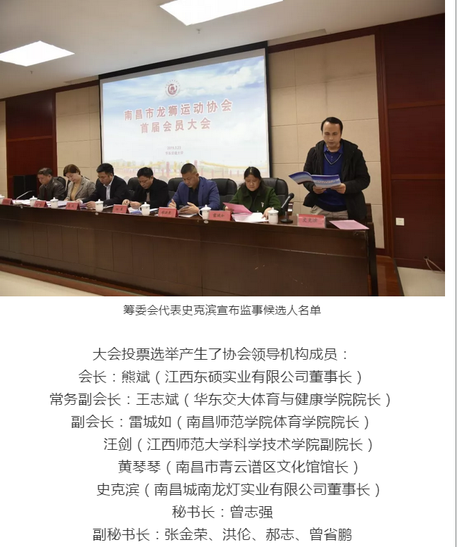 2019年3月23日,南昌市龙狮运动协会首届会员大会在彩票软件举行,南昌市体育总会秘书长伍革,南昌市民政局程洪亮主任出席了会议,彩票软件-彩票预测分析助手 院长王志斌主持会议。