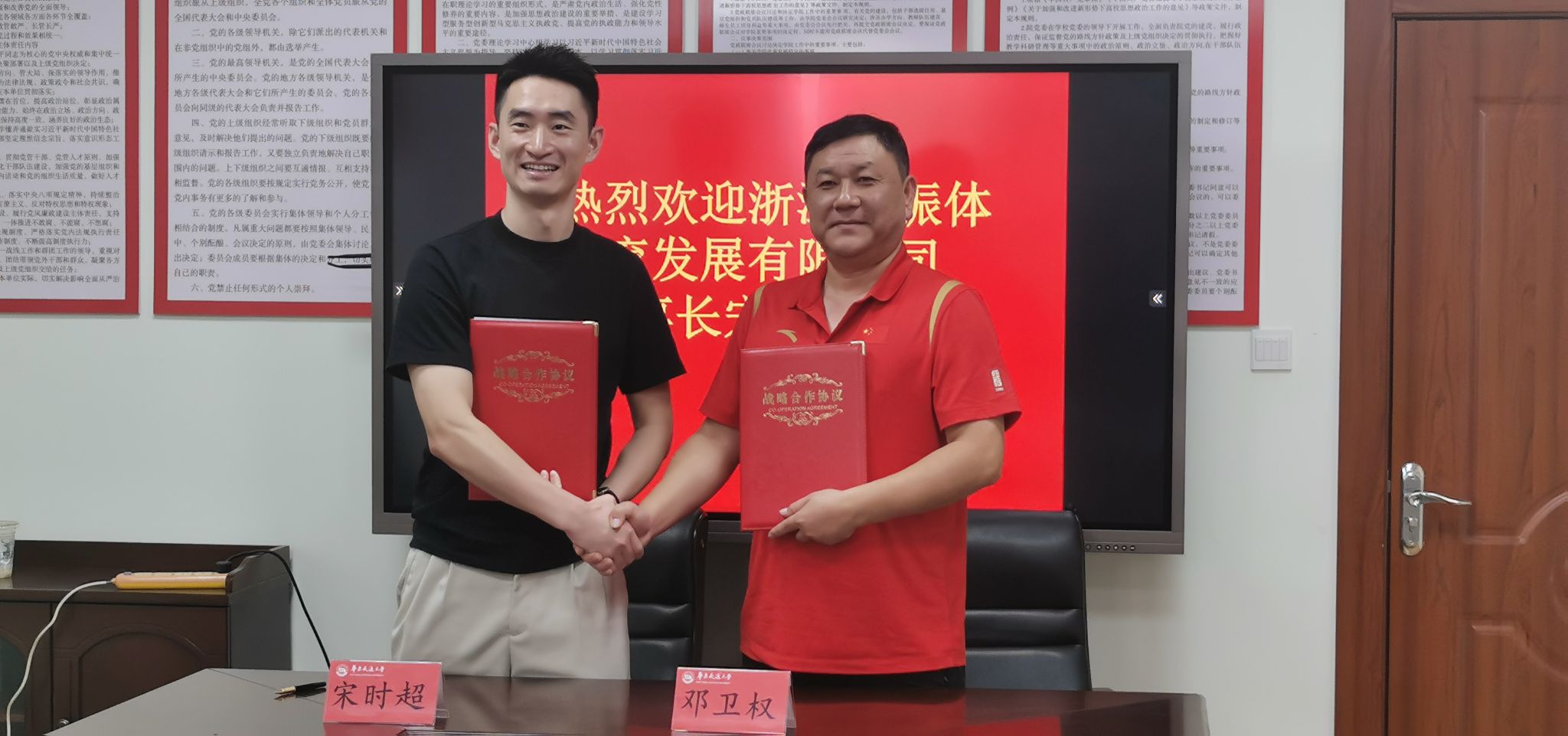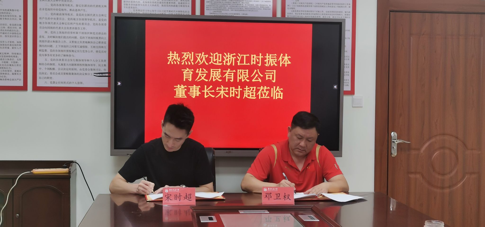 概况,以及专业设置、学科建设、高水平运动队、人才培养、创业就业等情况。宋时超介绍了公司发展历程,以及从运动员转变为体育企业经营者的心路历程,希望与学校在人才培养、创新创业、实习培训等多方面深度融合、共同发展。双方就合作事宜进行了深入交流,并最终签订合作协议。