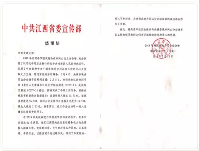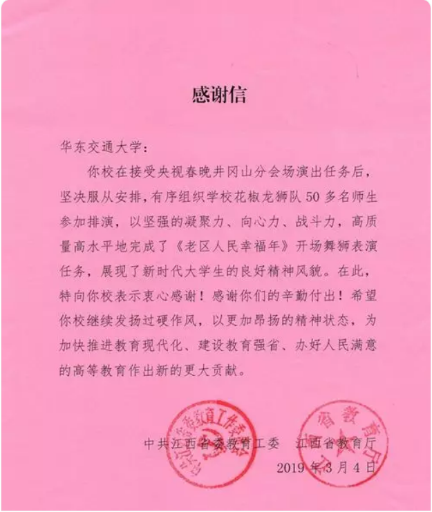 近日,彩票软件分别收到了江西省委宣传部和江西省教育工委(教育厅)的感谢信,对彩票软件“花椒龙狮队”圆满完成2019年央视春晚表演任务给予表扬。
